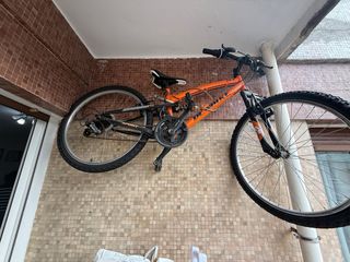 Bicicleta de montaña de color naranja. - Cuadro de aluminio. - Ruedas de 24 pulgadas. - Frenos de disco. - Habría que cambiar los neumáticos