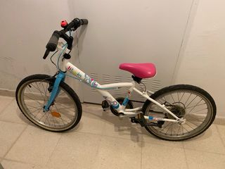 Bicicleta infantil Decathlon, ideal para niños de 6 a 8 años. Perfecta para iniciarse en el ciclismo. Solo falta revisar frenos, - Color blanco y azul. - Sillín rosa. - Timbre naranja.