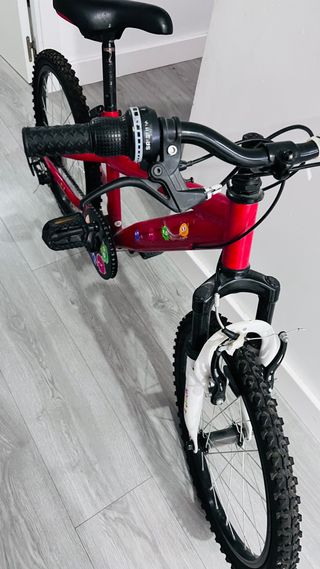 Bicicleta infantil BWTIN 900 RACING de 16 pulgadas en color rojo. Diseñada para niños de entre 4 y 6 años, con una altura de 105 a 120 cm. Este modelo se caracteriza por su ligereza gracias al cuadro de aluminio (pesa alrededor de 7,3 kg), lo que facilita su manejo y el aprendizaje. Incorpora el sistema "Stop Easy" de Decathlon, diseñado para manos pequeñas y que permite frenar fácilmente con dos dedos. Tiene marcas de uso pero está perfecta. La rueda trasera está lisa, regalo cubierta sin estrenar para cambiarla. Vendo por cambio a modelo mas grande