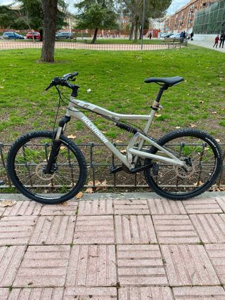 Bicicleta de montaña con doble suspensión, ideal para terrenos irregulares. Cuenta con un diseño robusto y componentes pensados para la aventura. - Cuadro de aluminio. - Frenos de disco. - Ruedas de 26 pulgadas. - Sillín deportivo. - Bolsa portaobjetos en el cuadro.