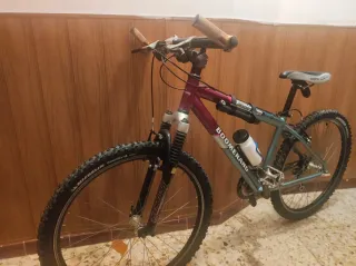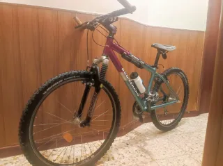 Bicicleta de montaña en color morado. - Cuadro de aluminio. - Ruedas de 26 pulgadas. - Frenos de disco. Lo de arriba lo ha rellenado la IA, no sé si será verdad. Llevo muchos años sin usarla y la vendo por hacer espacio en el trastero. Las ruedas están deshinchadas y no sé qué tal estará. Lo de las fotos es lo que hay. Si aún así te interesa, ese es el precio. Si finalmente alguien la quiere le pasaré un trapo para el polvo, pero no quiero dedicarle mucho más tiempo; solo quiero deshacerme de ella. El comprador tendrá que encargarse de ponerla a punto. La venta solo la hago en Parla.