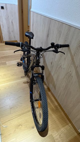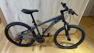 Bicicleta de montaña de 26" -Transmisión 3x7v que funciona muy bien -Desviador trasero y delantero Shimano -Frenos v-brake -Cubiertas mixtas B-TWIN Dry 26x1.95 en muy buen estado -Horquilla delantera con regulación en precarga Bicicleta completamente funcional, cambia sin problemas, frena bien, para alguien que quiera algo barato y que le haga buen servicio. Los pedales no son los de la foto, tiene puestos unos normales de montaña de plástico. También puedo ponerte unos de metal. Pregúntame sin problema.