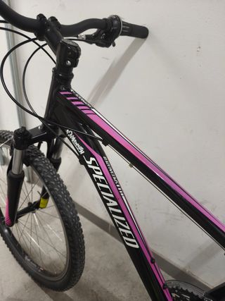 Bicicleta Specialized Hotrock 24 en color negro con detalles en rosa. - Cuadro de aluminio. - Ruedas de 24 pulgadas. - Frenos V-brake. Talla xs 21 velocidades
