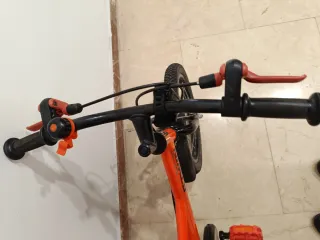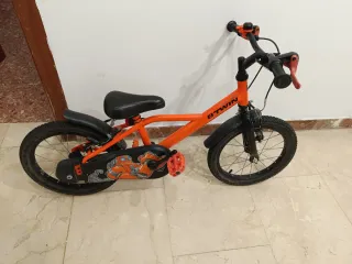 Bicicleta infantil Btwin de color naranja, ideal para los más pequeños. - Ruedas de 16 pulgadas. - Frenos delanteros y traseros. - Sillín ajustable. - Guardabarros delantero y trasero.