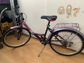 Bicicleta plegable de color plateado, modelo Folding 16. - Ruedas de 16 pulgadas. - Sillín negro con detalles rojos - Manillar ajustable. - Pata de apoyo. A la bicicleta hay q hacerle arreglos,ajustarle frenos,engrasar un poquito.. y arreglarle guardabarros trasero que se ve en la última foto. Se vende así tal cual por eso el precio