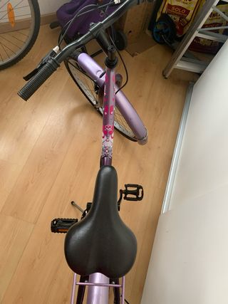 Bicicleta morada con detalles de flores y mariposas, ideal para niñas. - Ruedas de 20 pulgadas. - Frenos delanteros y traseros. - Guardabarros delantero y trasero. - Portabultos trasero. - Pata de cabra.