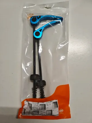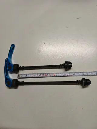 Par de ejes pasantes para bicicleta en color azul. Son ligeros y resistentes. - Material: Aluminio. - Color: Azul. - Incluye resortes. - Totalmente nuevos. (rueda, pasador, bost, dirección, mtb, carretera, paseo, cierre, llanta, freno, repuesto)
