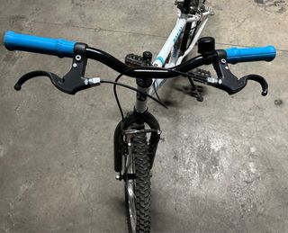 Bicicleta infantil de montaña con suspensión delantera y trasera. - Cuadro de color azul y blanco. - Ruedas de 26 pulgadas. - Frenos sin descaste. - Cambio Shimano de 18 velocidades. - De regalo el inflador que aparece en la foto Está casi sin usar, diría que nueva, apenas 5 usos ya que tenía miedo y no queria aprender.