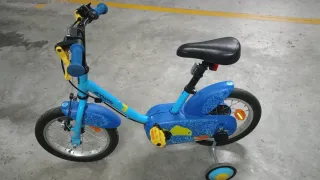 Bicicleta infantil BTwin en color azul, perfecta para los más pequeños. - Ruedines incluidos. - Diseño divertido con motivos marinos. - Frenos adaptados para niños.
