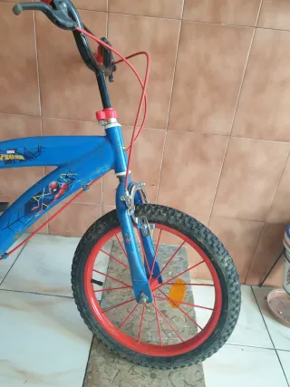 Bicicleta infantil con diseño de Spiderman, ideal para niños pequeños. - Color azul con detalles rojos. - Ruedines de apoyo incluidos. - Freno delantero y trasero, falta el guarbarro delantero como se ve en las fotos de allí su precio por lo demás perfecta.