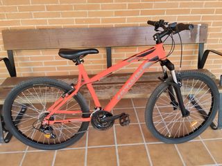 URGE VENDER mi Rockrider RR 5.2 muy cuidada, perfecta para iniciarse en el MTB o para moverse por ciudad con comodidad. Es una bicicleta robusta, fiable y que ha recibido una puesta a punto reciente. La bici está montada sobre un cuadro de aluminio ligero y resistente. Cuenta con suspensión delantera SR Suntour que absorbe las irregularidades y frenos de disco mecánicos delante y V-brake detrás, ofreciendo una frenada segura. El grupo de transmisión es SRAM de 6 velocidades con mandos SRAM de gatillo, precisos y fáciles de usar, ideales para cualquier terreno. Las ruedas son de 26" / 27.5" con cubiertas en buen estado. Desta