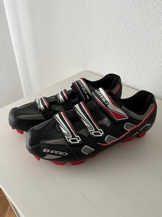 Zapatillas de ciclismo / spinning B-Pro en talla 45. - Cierre con velcros. - Suela con tacos para agarre. - Diseño deportivo en negro, rojo y gris. Muy poco uso, practicamente nuevas.