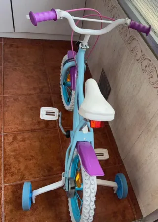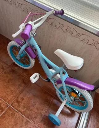 Bicicleta infantil con temática de Frozen, ideal para los más pequeños. - Color azul y morado. - Ruedines de apoyo incluidos. - Manillar con puños morados.