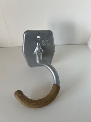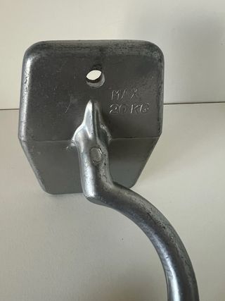 Práctico colgador de pared para bicicletas. Fabricado en metal resistente y con un recubrimiento protector en el gancho. - Capacidad máxima de carga: 20 kg. - Diseño robusto y duradero. - Incluye tornillo para montaje.