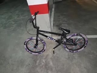 Bicicleta BMX de color negro con detalles llamativos. - Ruedas con diseño camuflaje morado. - Rayos de colores rosa y azul. - Manillar negro.