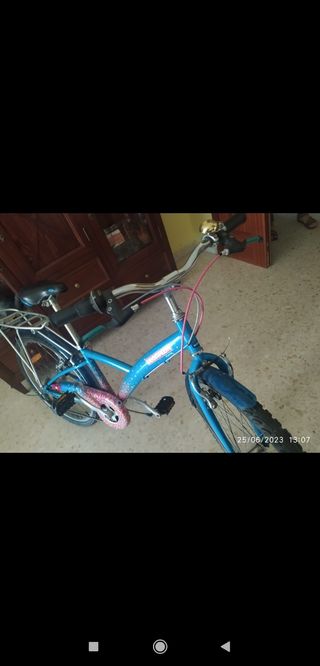 Bicicleta infantil Denbike en color blanco con detalles en rosa. - Ruedas de 24 pulgadas. - Frenos. - Sillín ajustable con palometa. - Cambio con 3 platos y 6 piñones. Lleva tiempo sin usar, por lo que tienes señales de óxido y cubiertas con alguna grieta. Para niños entre 120 y 150 cm aprox.