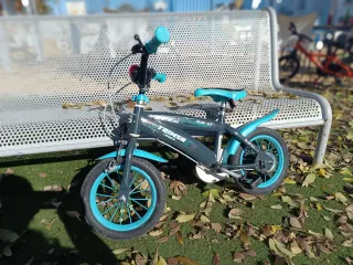 Bicicleta infantil en buen estado, ideal para los más pequeños a partir de 3 años. Pegatinas un poco despegadas pero está perfectamente Viene con sus rudines de aprendizaje, aunque no sale en la foto - Color azul y gris. - Ruedines incluidos.