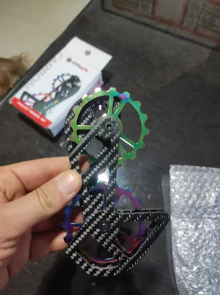 Conjunto de poleas de cambio para bicicleta, con un diseño llamativo y ligero. - Fabricadas en carbono. - Acabado iridiscente en las roldanas.