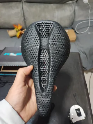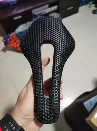 Sillín de carbono con diseño 3D y acabado en panal. TIENE UNA RUTA DE USO,SE VE LA MARCA EN LOS RIELES - Medidas: 259 x 145 mm. - Rieles: 7x9 mm. - Peso: 162 gramos.