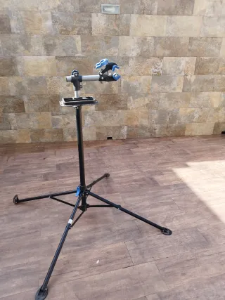 Soporte de reparación para bicicletas, ideal para mantenimiento y ajustes. - Construcción robusta y estable. - Pinza ajustable para diferentes diámetros de cuadro. - Bandeja para herramientas integrada. - Plegable para fácil almacenamiento.
