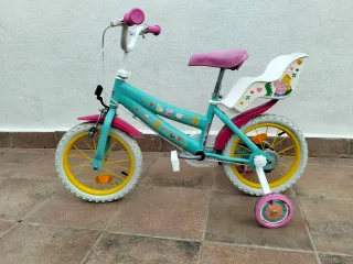 Bicicleta infantil con diseño de Peppa Pig, ideal para los más pequeños. - Color azul y rosa. - Incluye ruedines. - Sillín y cesta blancos.
