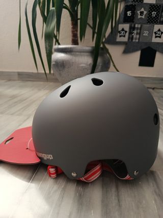 Casco de la marca Hang Up, en color gris y a estrenar. Casco certificado, ideal para skate, patinete, bicicleta o BMX. - Diseño moderno y seguro. - Correas ajustables para un ajuste perfecto.