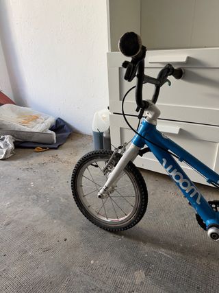 Bicicleta Woom 2 en color azul y blanco. - Cuadro de aluminio. - Ruedas de 14 pulgadas. - Frenos V-brake. Si queria comentar que habria que cambiarle la cadena. Esta bici nueva sin 400€ y una cadena vale 10/15€.