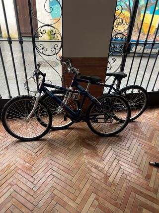 Se venden dos bicicletas de montaña una azul y la otra blancaSon ideales para paseos y rutas. - Cuadro de aluminio. - Suspensión delantera. - Ruedas de 26 pulgadas.La blanca con discos de freno hidráulicos. Les hace falta un repaso ya que llevan bastante tiempo paradas.Las dos son de 26 150€ las dos.