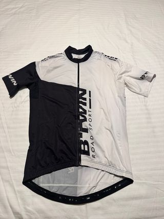 Maillot de ciclismo Btwin de manga corta, con diseño bicolor en blanco y negro. - Logo Btwin Road Sport. - Cremallera frontal. - Tejido ligero y transpirable. Se ha usado una vez.