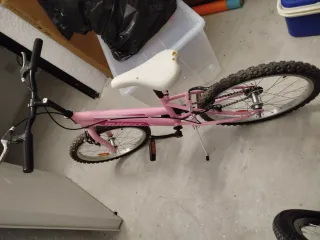 Bicicleta infantil de color rosa, ideal para las primeras aventuras sobre ruedas. Cuenta con un diseño llamativo y ruedas todoterreno. - Cuadro de color rosa. - Sillín blanco con algún desperfecto. - Pedales negros.