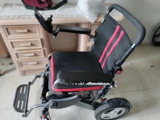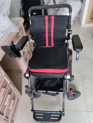 Silla de ruedas eléctrica Explorer XL3, diseñada para ser plegable y fácil de transportar. - Color negro con detalles en rojo. - Reposabrazos acolchados. - Joystick de control. - Reposapiés. - Ruedas traseras. - Ruedas delanteras.
