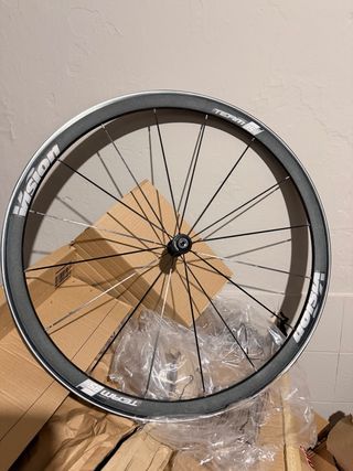 Ruedas de carretera Vision Team 35. - Perfil de 35mm. - Construcción en aluminio. - Radios negros. Están en muy buen estado, pista de frenado en color oscuro. Se incluye núcleo para Shimano.