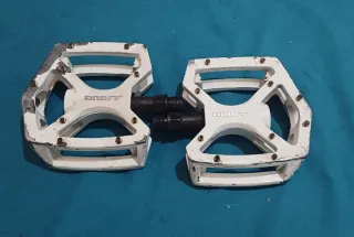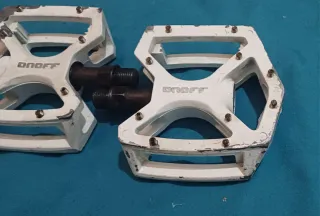 Par de pedales de bicicleta de la marca ON OFF en color blanco. Son pedales planos con cuerpo de aluminio y pines. - Cuerpo de aluminio. - Pines para agarre. Se puede enviar o recoger en Granada