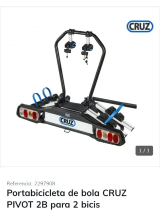 Compré dos.Está en su caja nunca abierto.El portabicicletas de la imagen es el modelo CRUZ Pivot eBike 2. Es un portabicicletas de bola de remolque diseñado específicamente para transportar hasta dos bicicletas eléctricas u otras bicicletas pesadas. Características clave Capacidad de Carga: Puede transportar 2 bicicletas con una carga máxima de 30 kg por bicicleta y 60 kg en total. Compatibilidad: Diseñado con raíles anchos y correas largas que se adaptan a neumáticos de hasta 4,8 pulgadas (Fatbikes) y a cuadros de 26-55 mm. Funcionalidad: Es abatible mediante pedal, lo que permite un acceso cómodo y fácil al maletero del vehículo