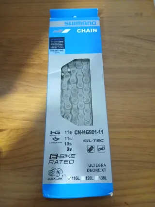 Cadena Shimano CN-HG901-11 para 11 velocidades, apta para E-Bike. - Tecnología SIL-TEC. - Incluye QUICK-LINK para fácil instalación. - Compatible con grupos ULTEGRA y DEORE XT. - Disponible en longitudes 116L, 126L y 138L.