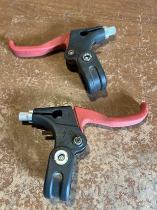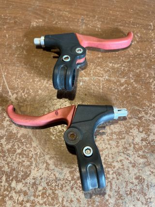 Par de manetas de freno para bicicleta infantil. Fabricadas en plástico y metal, con un diseño ergonómico para manos pequeñas