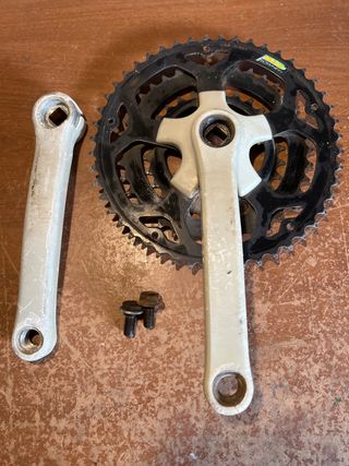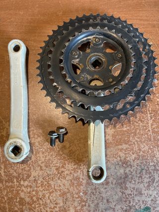 Pedalier de bicicleta con tres platos. - Plato grande con 48 dientes - Bielas de acero con recubrimiento en plástico. Incluye roscas para instalar - Bielas 170 mm longitud Hago envíos . Más piezas en mi perfil