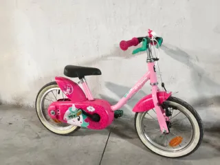 Bicicleta infantil de color rosa, con diseño divertido y llamativo. - Ruedas de 14 pulgadas. - Frenos delanteros y traseros. - Sillín ajustable. - Incluye ruedines de aprendizaje.