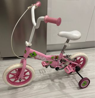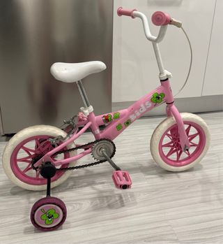 Bicicleta infantil de color rosa, ideal para los más pequeños. Ruedines incluidos para mayor estabilidad.