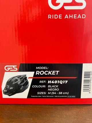Casco de ciclismo GS modelo Rocket en color negro. - Talla M (54-58 cm). - Referencia: H401Q17. - Fecha de producción: 15-03-2022.