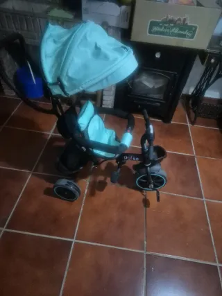 Triciclo para paseo de bebés, con capota y asiento acolchado. - Color: Turquesa y negro. - Diseño moderno y funcional. - Ruedas resistentes.