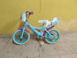 Bicicleta infantil con temática de Frozen. Ideal para las pequeñas de la casa. - Color azul y morado. - Incluye cesta delantera y asiento trasero.