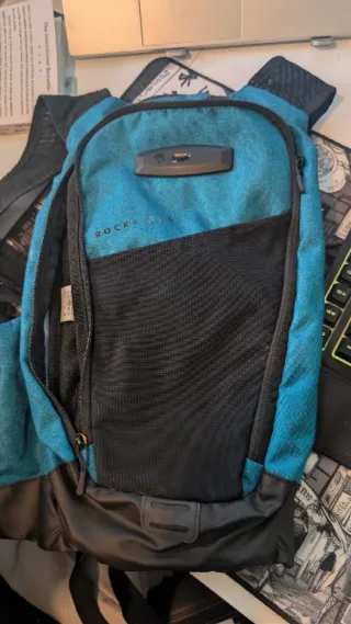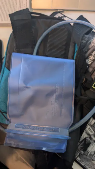 Mochila de hidratación 2L Rockrider, ideal para ciclismo. - Color azul y negro. - Compartimento frontal de malla. - Cierre de cremallera. - Detalle de logo en la parte frontal. - Camelback Incluido
