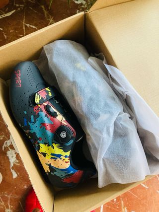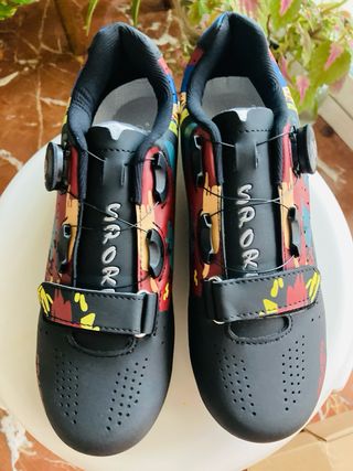 Zapatillas de ciclismo con un diseño moderno y llamativo. Para ruta o mtb - Talla 39. - Cierre de dial. - Detalle de salpicaduras multicolor.