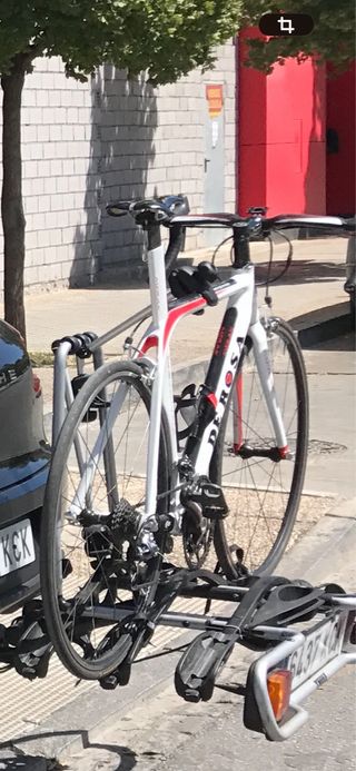 Portabicicletas de color negro y rojo. Solamente es uno, el otro no está. - Estructura metálica. - Incluye soportes de sujeción.