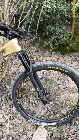 Bicicleta canyon MTB talla L - Cuadro aluminio de aleación (1989g) - Ruedas DT SWISS - Horquilla Fox 32 - Grupo XT - Cubiertas MAXXIS tubulares Mantenimiento recién hecho, frenos sangrados, pastillas, horquilla, Liquido tubular. Tiene roces por dejaste de uso, el bloqueo de horquilla estropeado.
