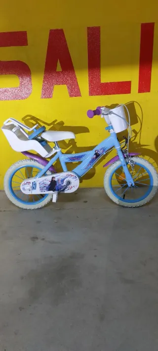 Bicicleta infantil con temática de Frozen, ideal para los más pequeños. En perfecto estado. - Color azul y blanco. - Diseño con personajes de Frozen. - Incluye cesta delantera y asiento trasero. - Ruedines muy fácil de poner y quitar