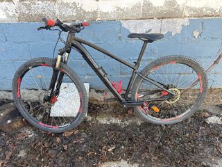 Bicicleta de montaña Rockrider en color negro. Lista para tus aventuras. - Cuadro de aluminio. - Ruedas de 29 pulgadas. - Frenos de disco. - Amortiguación delantera. - Recamara tubelizada antipinchazos. - Cambio de 9 velocidades. - Monoplato.