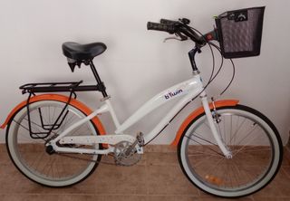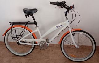 Bicicleta urbana Btwin en color blanco, ideal para desplazamientos diarios. - Cuadro de bicicleta. - Ruedas con llantas naranjas. - Cesta delantera y - portabultos trasero incluido.