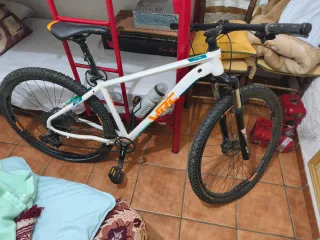 Bicicleta de montaña con un diseño moderno y deportivo. - Cuadro de color blanco con detalles naranjas y turquesas. - Ruedas de 29 pulgadas. - Frenos de disco. - Sillín con detalles naranjas. - Incluye portabidón.